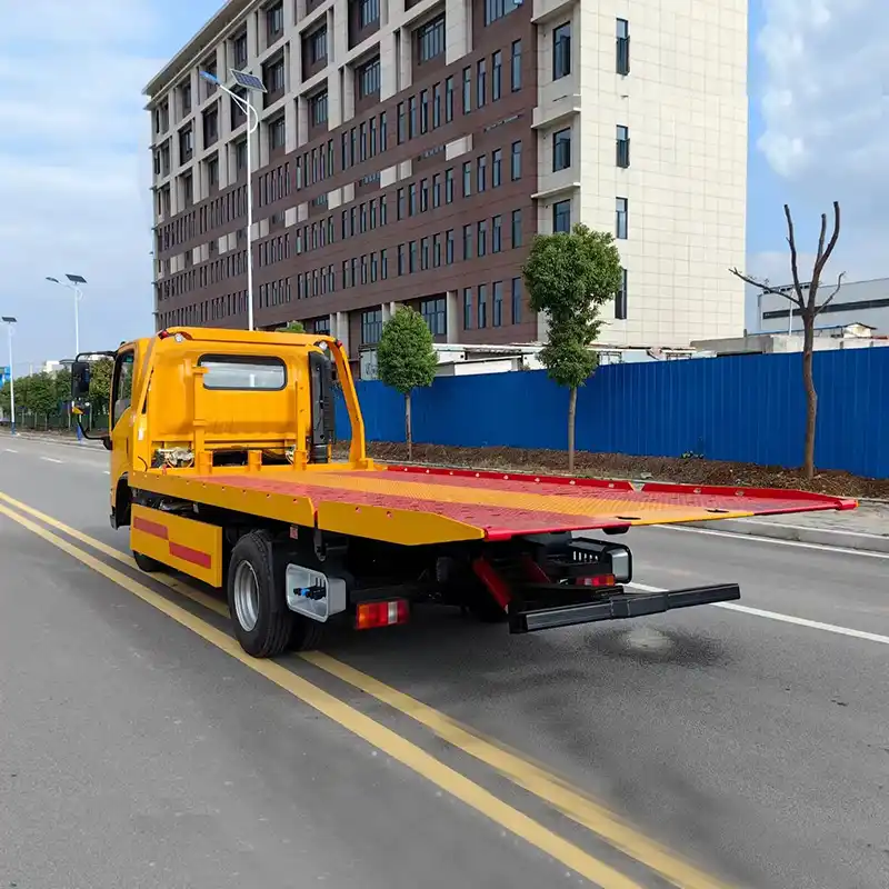 1. Эвакуатор с полностью опускающейся платформой: Платформа позволяет полностью опустить автомобиль на землю. При эвакуации автомобилей с низким шасси это облегчает погрузку автомобиля на платформу и минимизирует повреждения неисправного транспортного средства.
