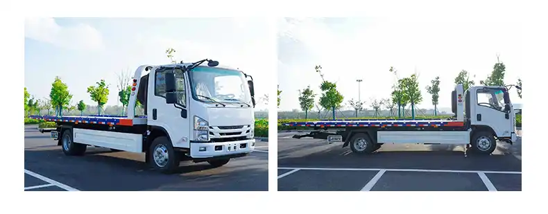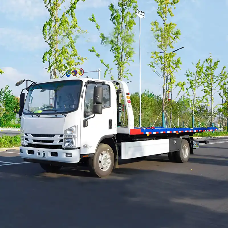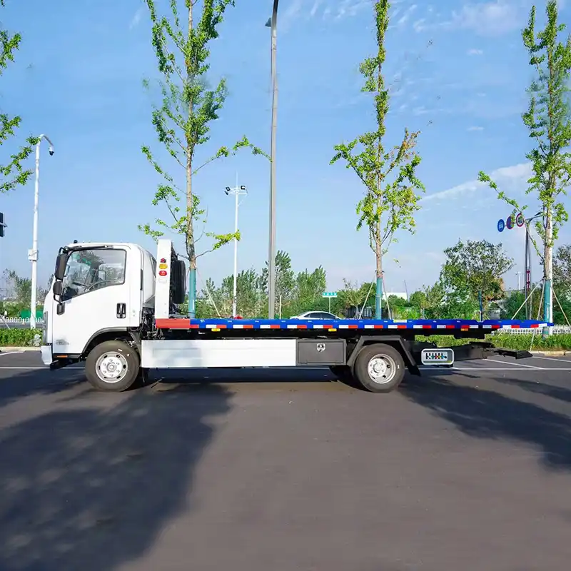 1. Эвакуатор с полностью опускающейся платформой: Платформа позволяет полностью опустить автомобиль на землю. При эвакуации автомобилей с низким шасси это облегчает погрузку автомобиля на платформу и минимизирует повреждения неисправного транспортного средства.